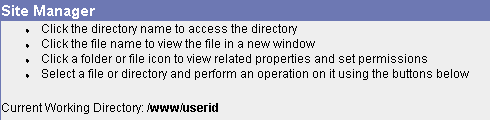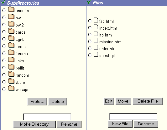 - Through this web interface, you can click on the appropriate buttons to move, delete, and modify files that you have created. As your web knowledge increases, you may create more folders for better organization. The left side of the screen controls the directories and subdirectories of your account. The right side controls the individual files.